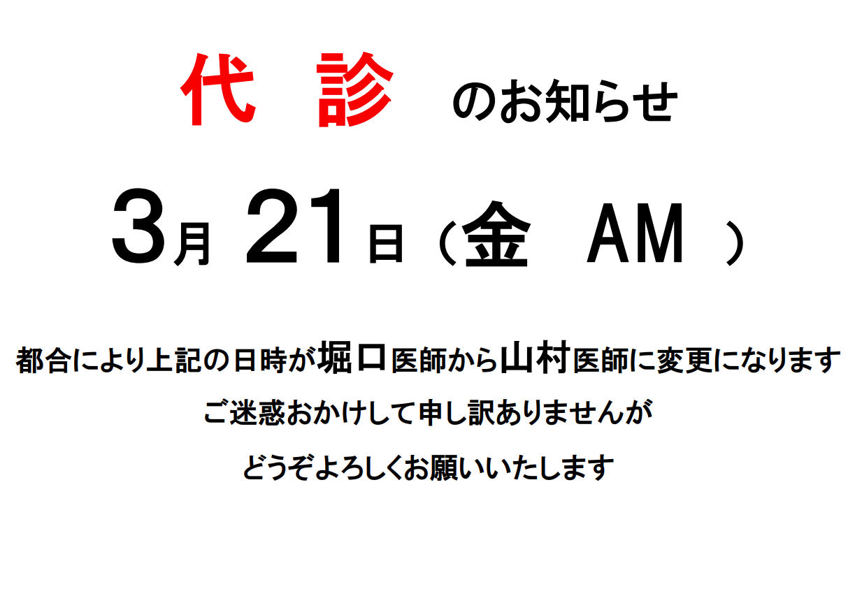 都合により3月21日(金・AM)は堀口医師から山村医師に変更になります。