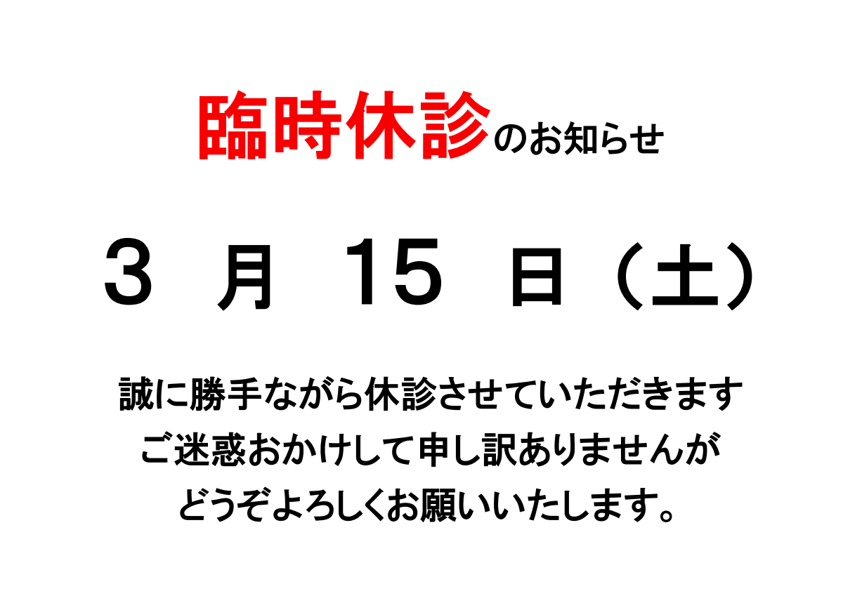 誠に勝手ながら3月15日(土)は休診させていただきます。